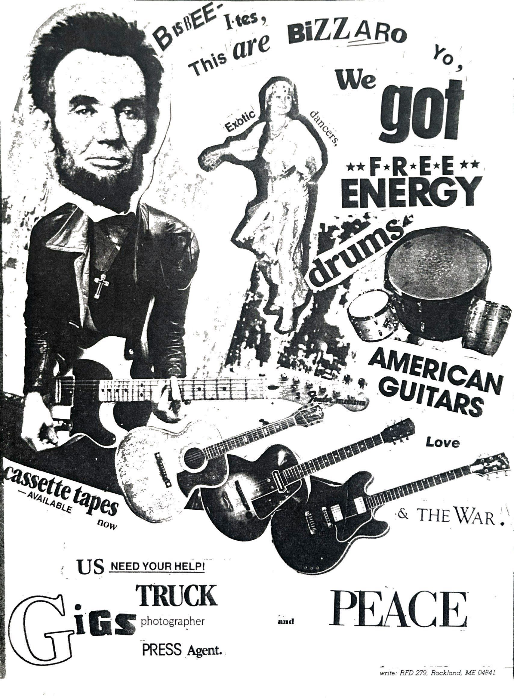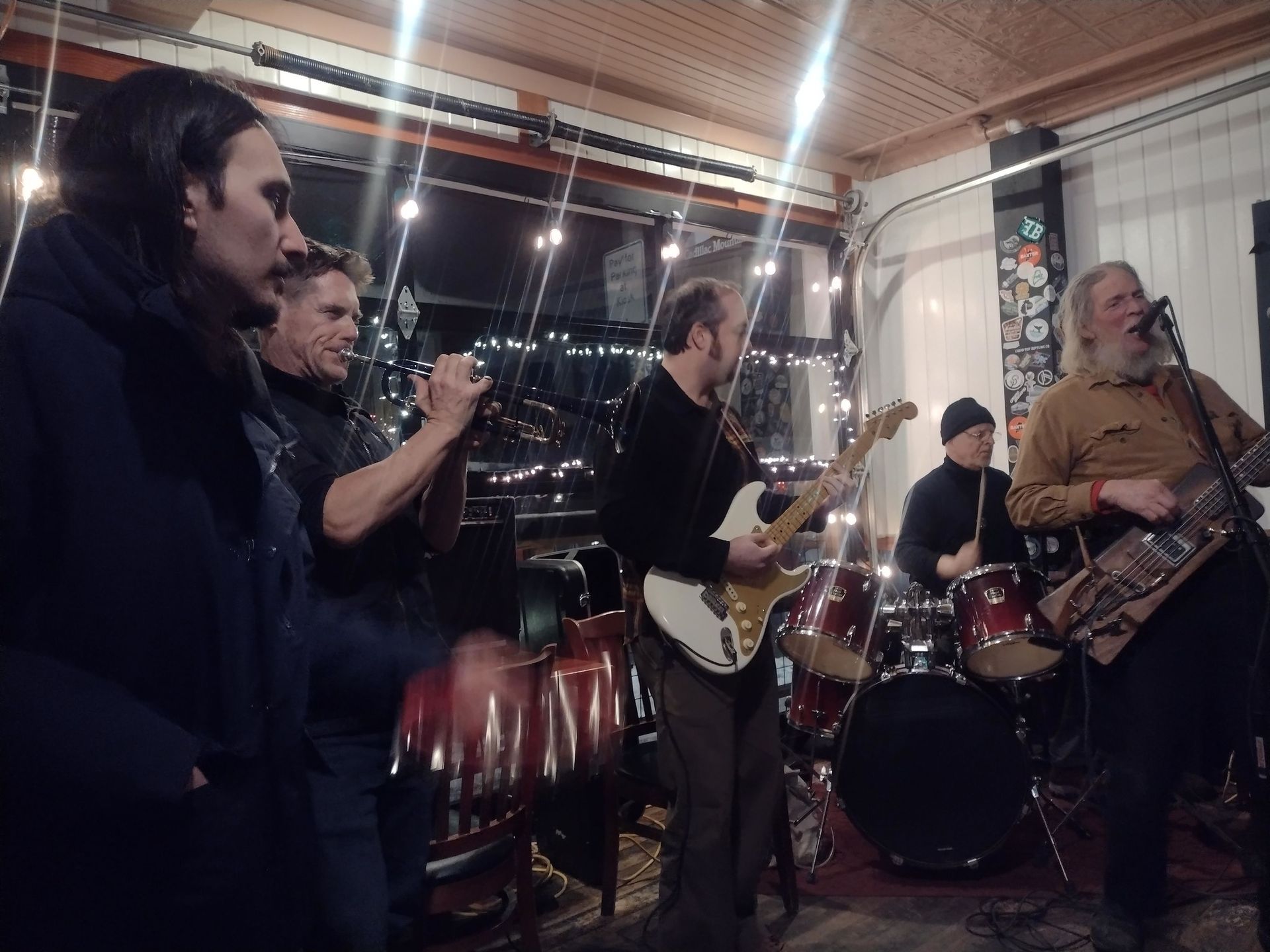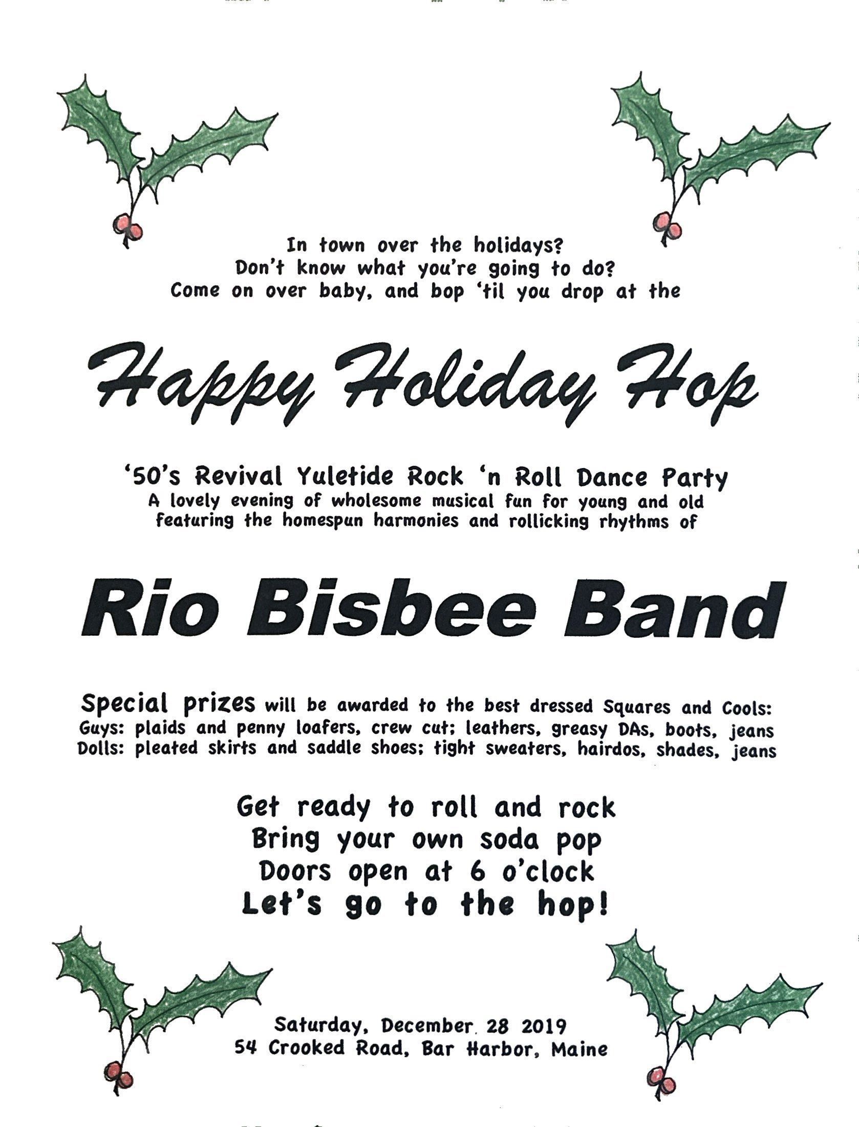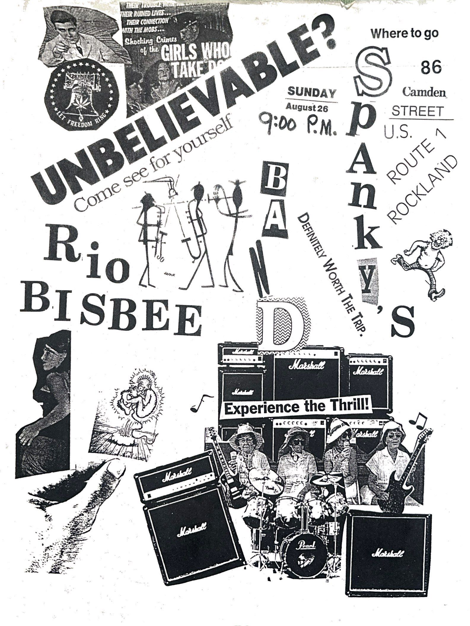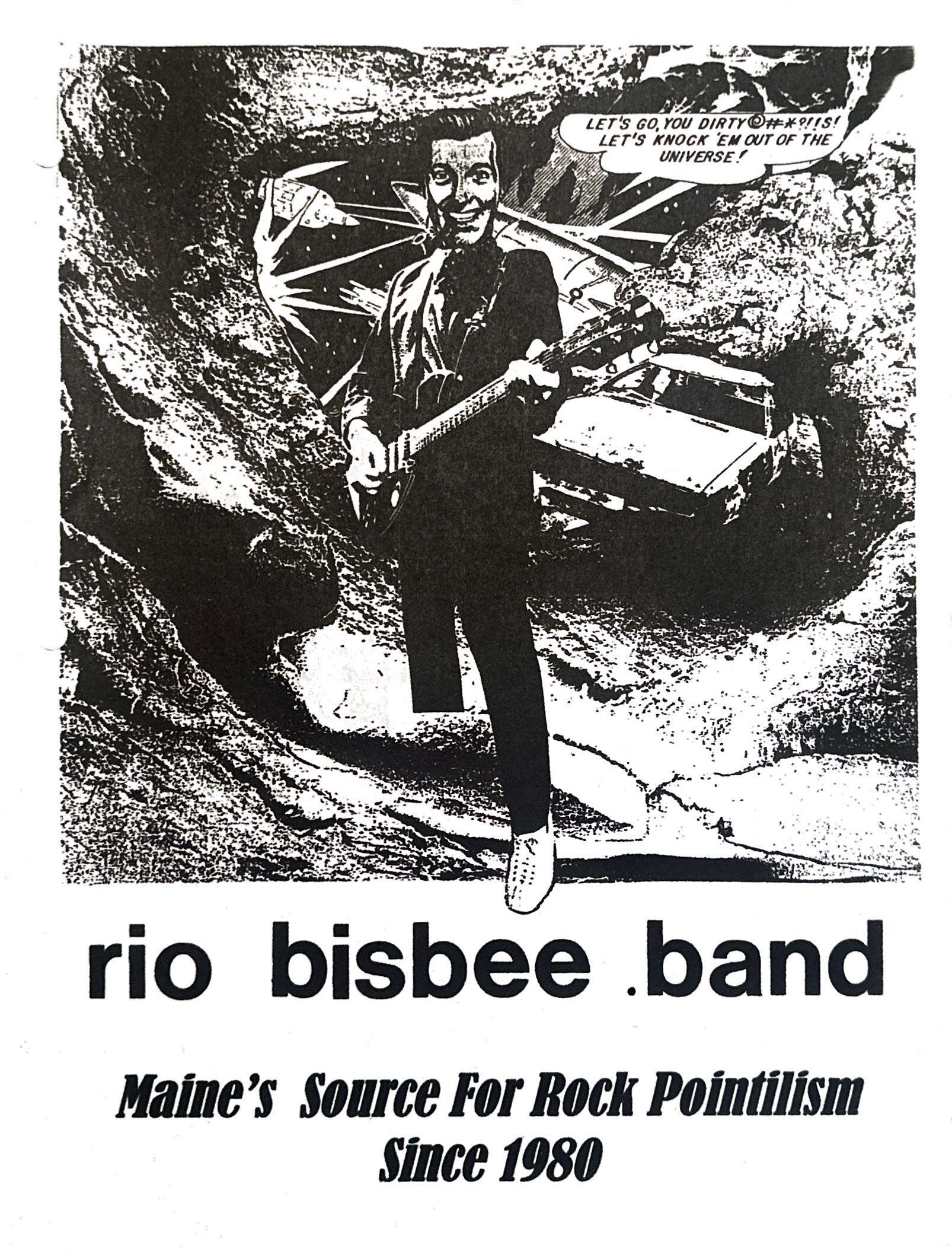 On the sixth day 1980, from out of The Void, by the banks of the mighty Bisbee River of Camden, Maine was formed a band. It was called Rio Bisbee for the river. It was good. Originally configured as a contradance orchestra, Rio Bisbee.Band began as a safe sextet featuring fiddle, guitar, banjo, concertina, trumpet, bass, playing polkas, schottisches, waltzes, hornpipes, reels, jigs at thirteen gigs around Mid-Coast Maine that year. Later, things got wierd when a dominant chord was heard, and fiddle, banjo and squeeze box split. Rob, peripatetic lead guitarist returned from south of the border after studying with Manuel Labor, Argentine guitar master, and Rio Bisbee degenerated to Rock ‘n Roll - roots music of our childhood.